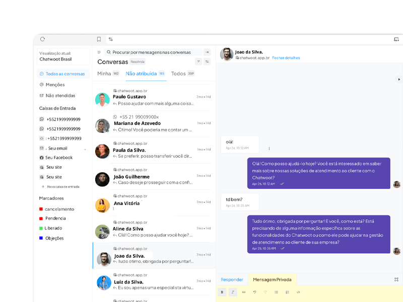Colaboração em equipe. Vários membros da equipe podem trabalhar juntos em uma conversa, atribuir tarefas uns aos outros e compartilhar notas internas para fornecer um suporte coeso e eficiente.